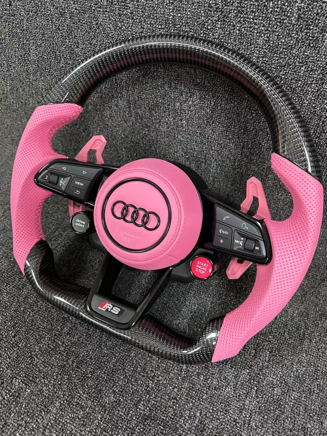 Audi carbon fiber steering wheel - custom fan leather + pink paddles + two knobs