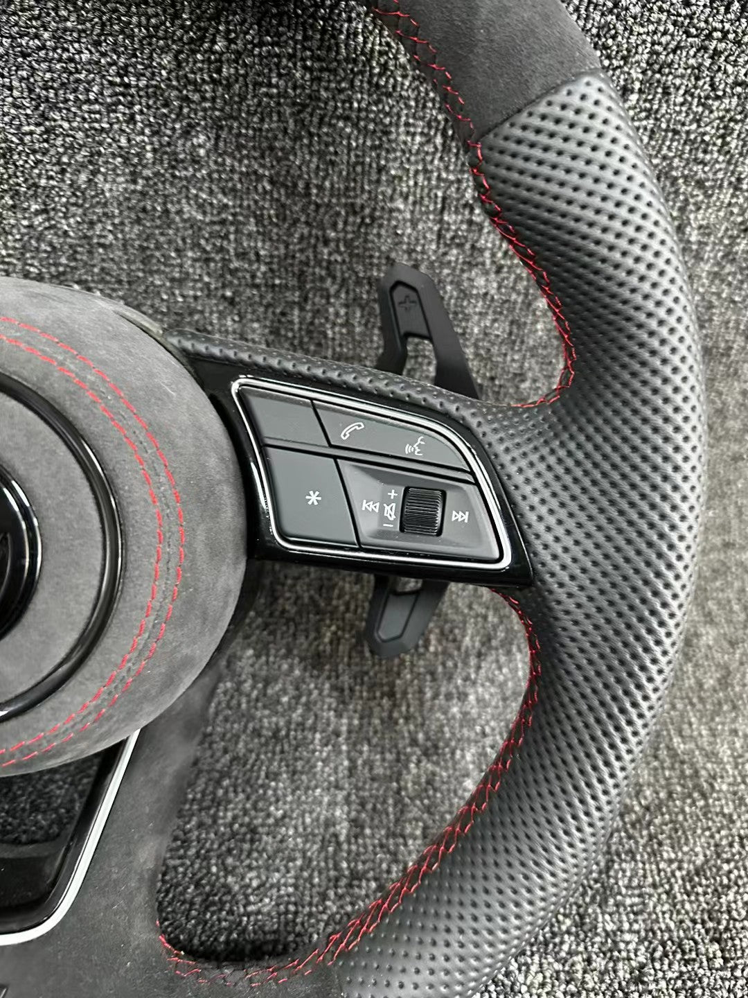 New upper and lower Alcantara, left and right leather perforated multifunctional buttons, Lamborghini paddle shifters in red and yellow with return logo Alcantara horn cover