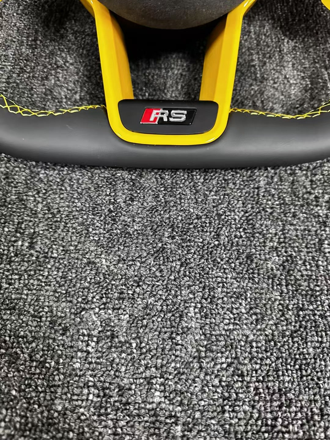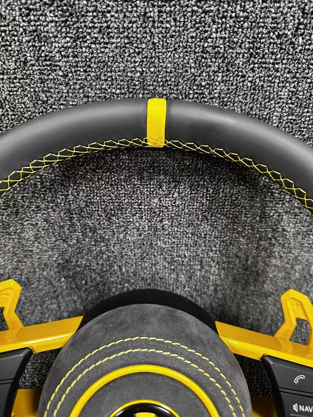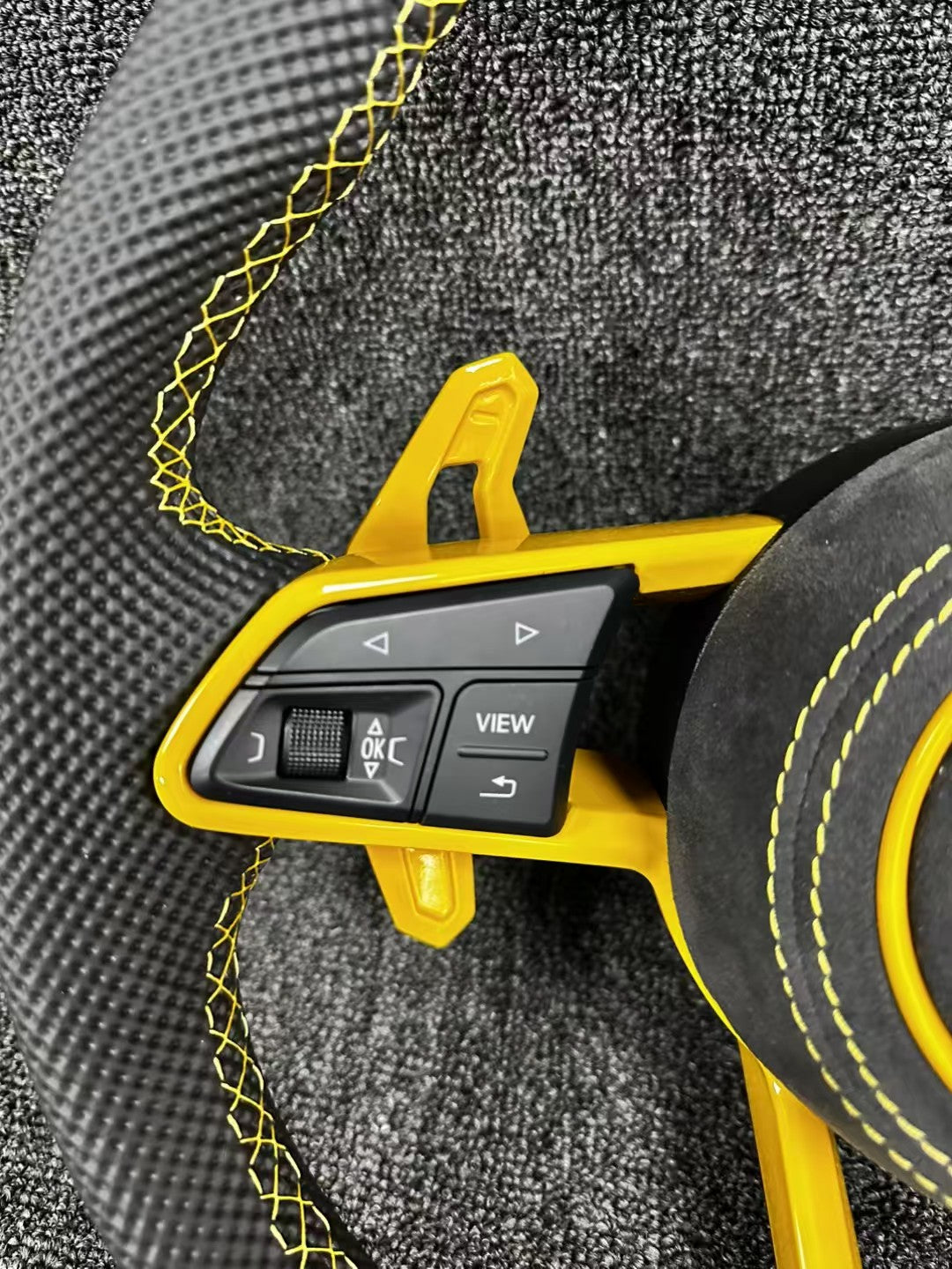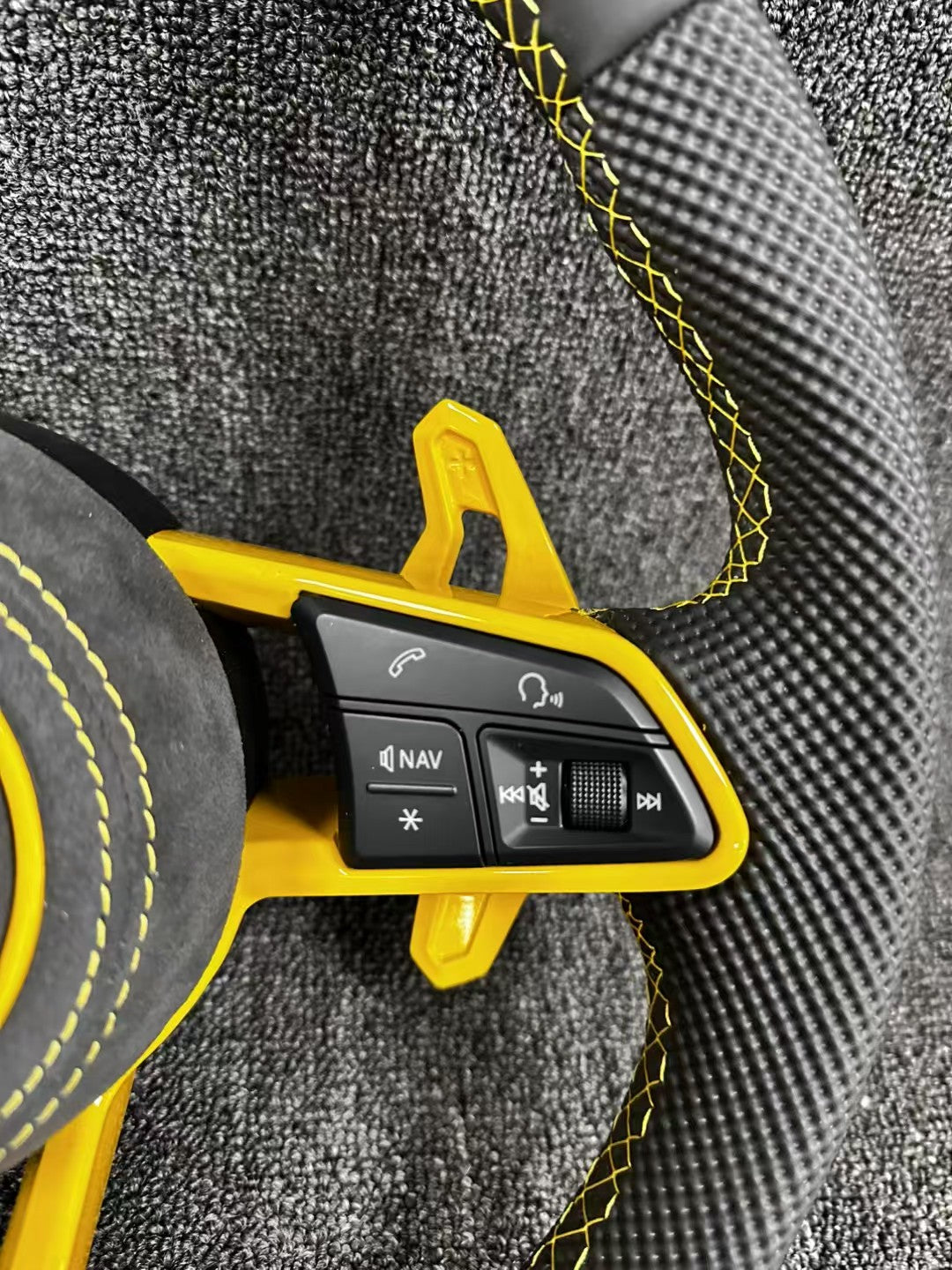 Volkswagen R8 steering wheel yellow button frame paired with yellow Lamborghini shift paddles