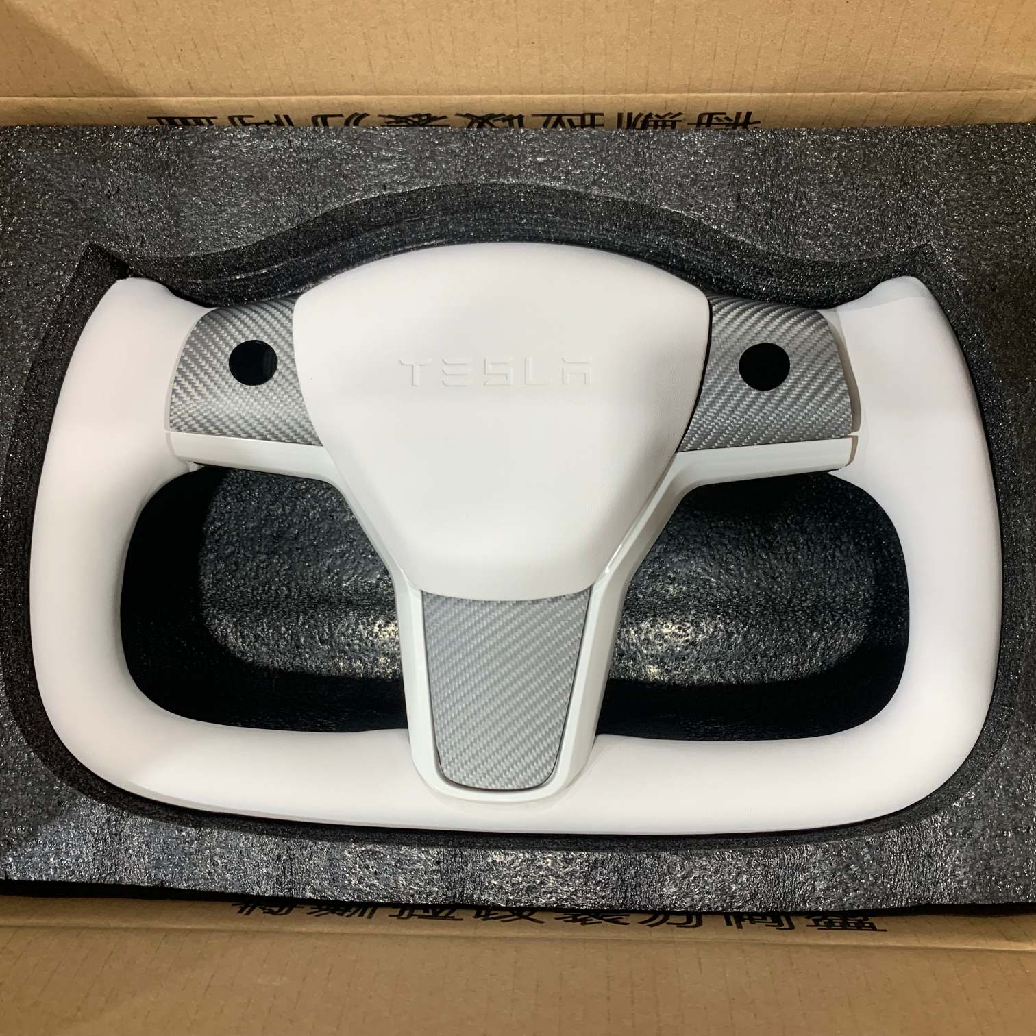 Yoke steering wheel with bright carbon or matte carbon trim with carbon side panels and heated custom speaker covers for Tesla Model 3/Y